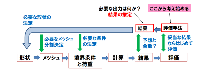 これは以下の図のように、まず評価指標をきちんと考え、その後、そのために必要となる出力を決定し、それを導くために形状と境界条件とメッシュを決めるというものです。