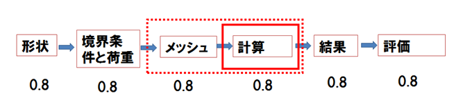 また、構造解析を設計者自身が行う、設計者CAEでは「だいたいわかっている」エンジニアが解析を行うことが多いですが、これはなかなか答が合いません。理由は以下の図で示すように、構造解析の6つの要素のうち、それぞれを80%の信頼性(単独では十分高いです)で実施した場合、結果として0.86=0.23 となってしまうためです。全体で信頼性を0.8以上にするには、単独の要素は0.97以上でなくてはなりません。100点満点の97点です。つまり、それぞれについては「完全にわかっている」エンジニアでないと、十分な信頼性を持つ構造解析はできないということになります。
